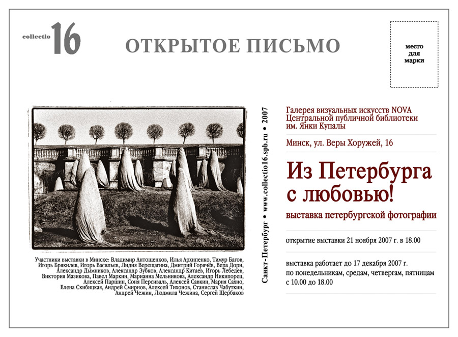 Организаторы проекта Collectio16 – Марианна Мельникова и Дмитрий Горячёв, фотографы и участники проекта, сумевшие собрать и объединить произведения на первый взгляд очень разных, порой противоречивых, авторов Петербурга в законченные продуманные серии открыток. Фотооткрытки было решено издавать в форме ОТКРЫТОГО ПИСЬМА. Может быть, и само слово ОТКРЫТКА произошло от сокращения этого названия?..