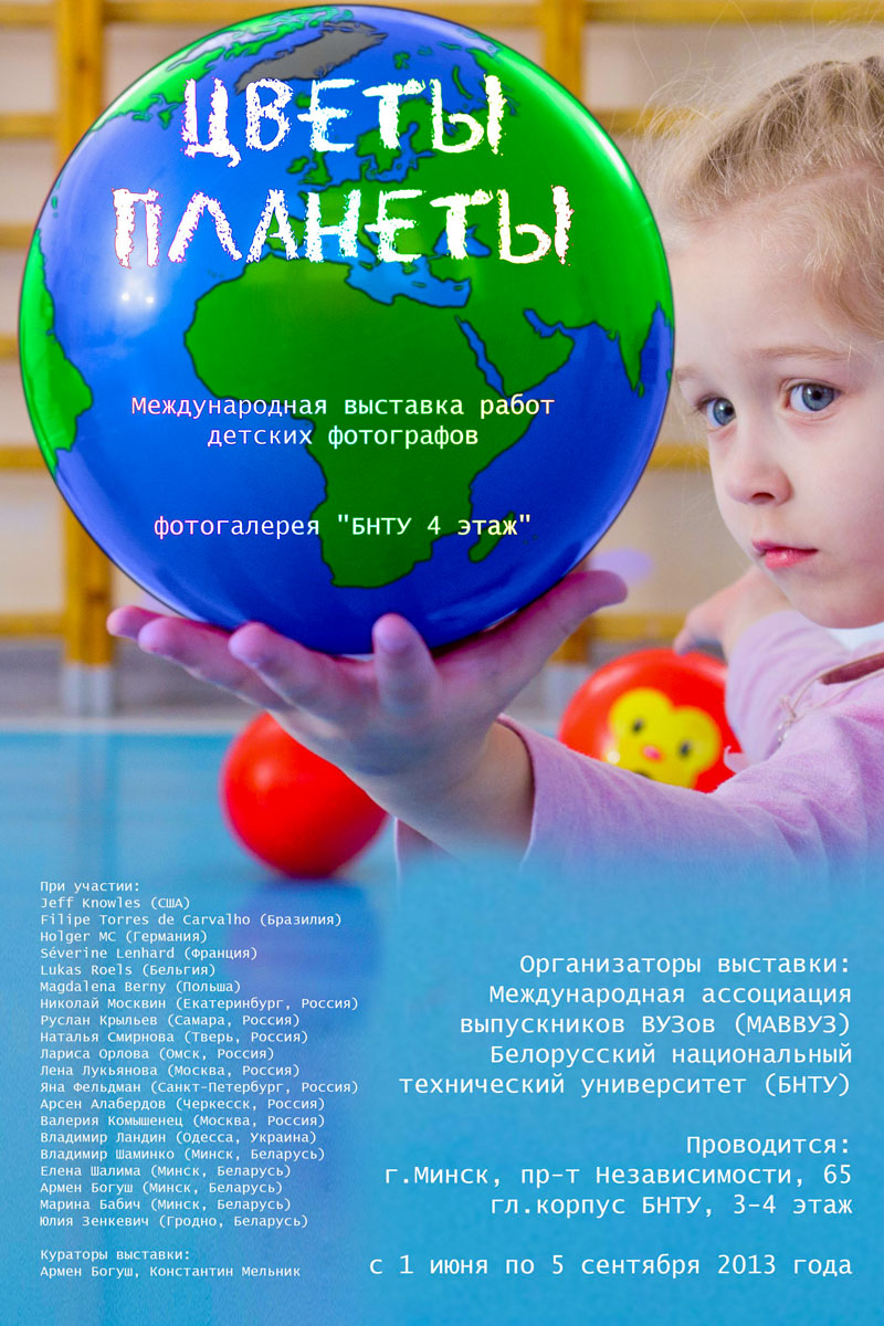 К дню Защиты детей, галерея "БНТУ. 4 этаж", сохраняя приверженность к "детской" теме, предлагает зрителю экспозицию международной фотовыставки "ЦВЕТЫ ПЛАНЕТЫ". В экспозиции фотографии из Бразилии, США, Германии, Украины и многих других стран.