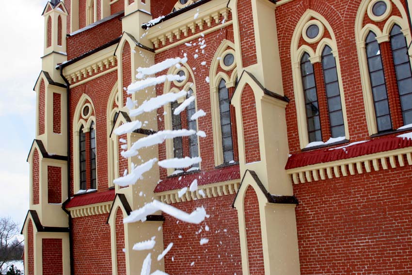 Мне очень нравится одна работа в этой серии – та, где снег падает с крыши, а Дева Мария смотрит на мир и на нас. Валерий мне как-то рассказал, как делался этот кадр. Он долго стоял на холоде и ждал момента, когда снег сорвется с крыши, но тот все не падал и, отчаявшись, Валерий решил уже уйти, но, сделав несколько шагов,