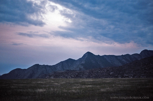 Вместе с Белой Совой мы были на Алтае и решили провести одну ночь на плато Большого Яломана. Днём там жара неописуемая, да и археологи ведут раскопки захоронений великих воинов, а ночью - прохладно и никого нет. Мы набрали воды, взяли по охапке хвороста и, поднявшись на плато, устроили крохотный лагерь. Пока Сова жарила замешаные на воде блины, я сделал этот снимок и, поглазев немного на горизонт, вернулся к костерку c мрачным предчувствием. Не успели мы поужинать, как из темноты на огонь стали слетаться мотыльки. Огромные - таких не видел раньше. Я еще подумал: может, они не тянутся к свету, а боятся темноты? Предчувствие не обмануло меня. Со стороны горной гряды донесся глухой шепот. Языки пламени подернулись, и вскоре мы увидели стену из пыли и песка, несущуюся на нас со стороны гор, как призрачный табун лошадей. Успели только отвернуться и закрыть ладонями глаза от песка. Ветер раскидал костер и только чудом не сорвал палатку. Он бесновался всю ночь, а мы так и не смогли толком поспать...