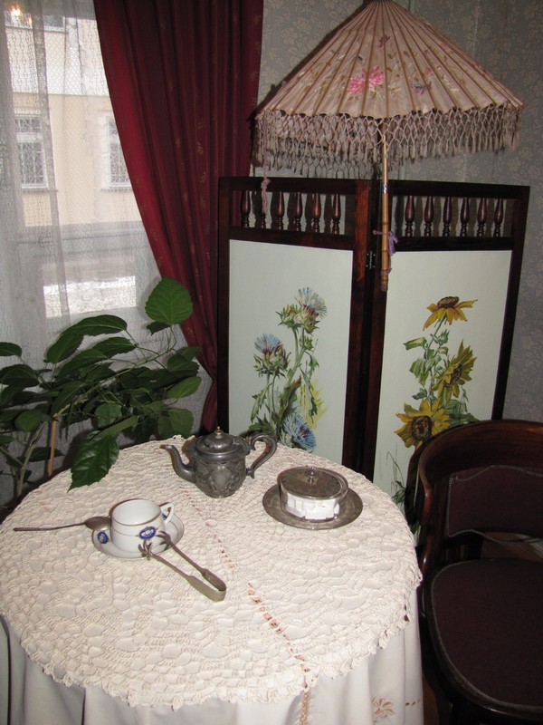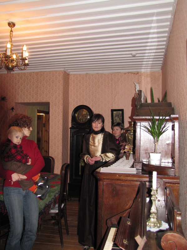 Гостей встречала и провела по дому мать поэта Марыя Апанасауна (экскурсовод в стилизованном наряде того времени), она рассказала про жизнь семьи Богдановичей в Гродно, про их дом, про детей и мужа, и угостила всех чашечкой чая под звуки стародавней фисгармонии.