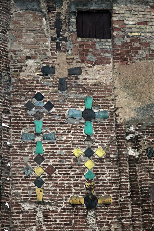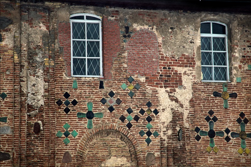 Мне довелось гулять по Гродно всего один раз, года 2,5 назад. Тогда, оказавшись возле Коложской церкви, нам рассказала местная жительница о том, что при строительстве использовались кирпичи, на которых были изображены языческие символы, которые всячески пытались «затереть» священнослужители, спустя какое-то время. Но кое-где еще можно увидеть увидеть эти знаки.