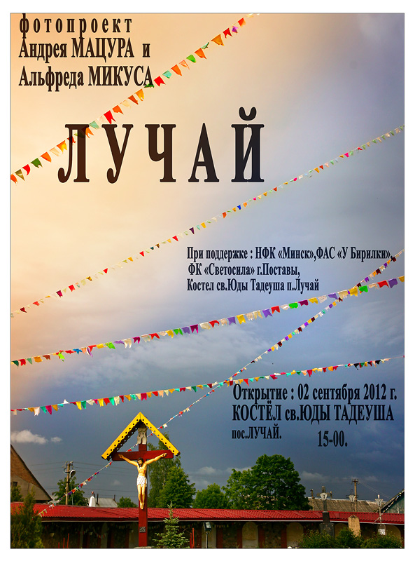 02 сентября 2012 г. в Костёле св.Юды Тадеуша пос.Лучай Поставский район состоится открытие фотовыставки «Лучай» Андрея Мацура и Альфреда Микуса.. Это большой фото-проект (50 фото 30х40),показывающий современную католическую жизнь костёла в прекрасном и богатом духовными традициями пос.Лучай.Ксёндз Николай Липский,который уже пять лет возглавляет приход,вместе со своими прихожанами организовывает праздники и концерты,много усилий прилагает для обновления и благоустройства костёла Святого Юды Тадеуша в Лучае.