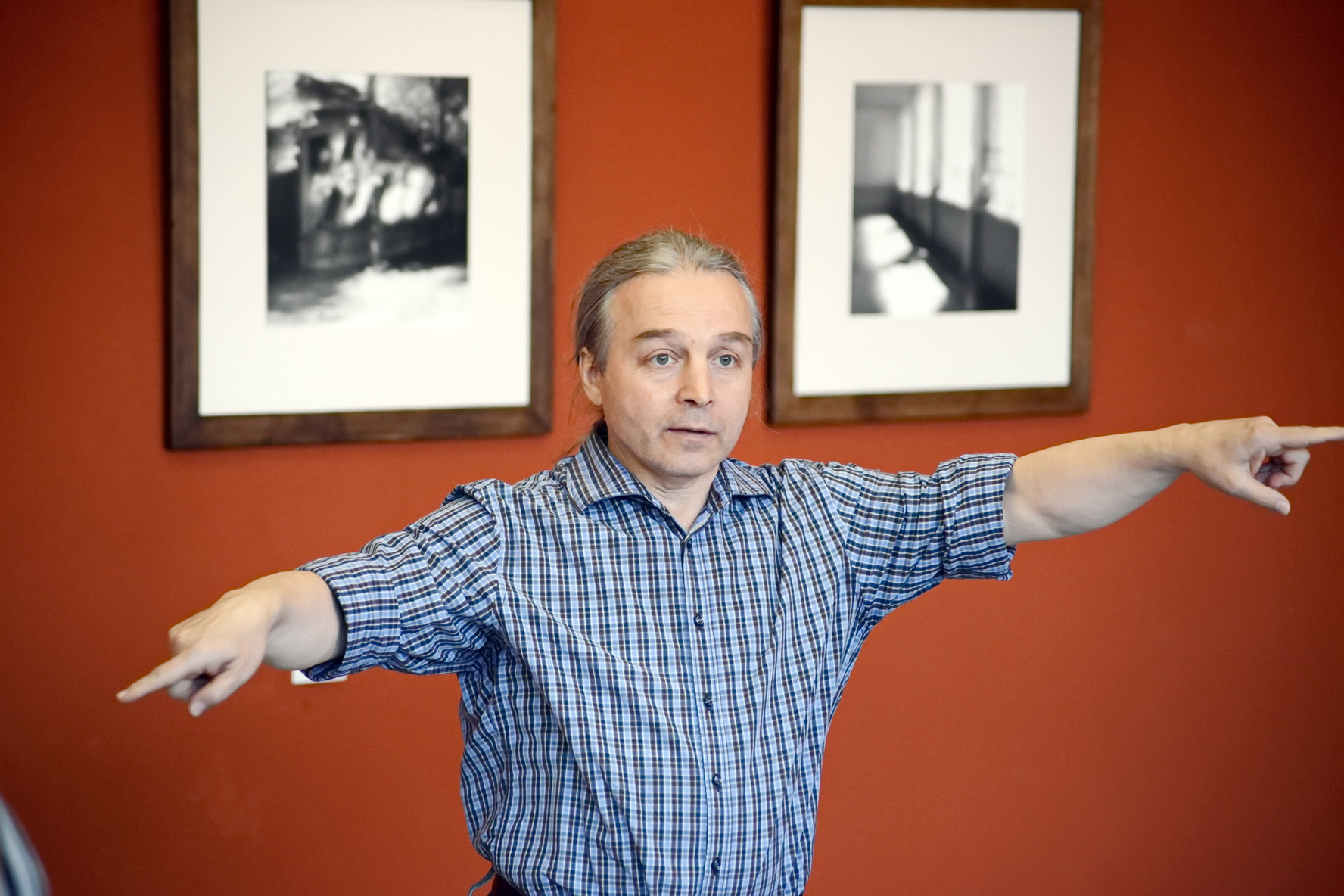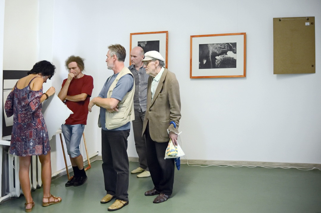 Или же пройти прямо по ходу и попасть зал с фотоработами, в котором мне посчастливилось увидеть ситуацию в тот час, когда непредсказуемая фантазийная Екатерина Гуртовая с друзьями восстанавливала не выдержавшую зрительского напора систему бесстекольного крепления паспарту больших отпечатков.