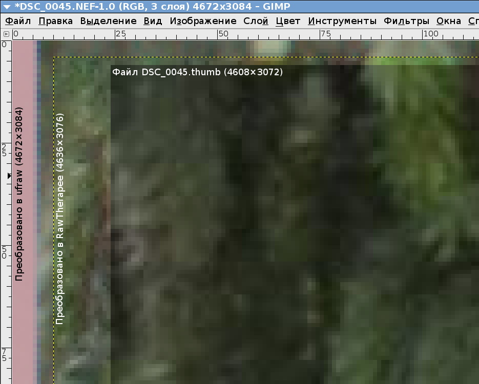 Ниже -- часть скриншота экрана GIMPа, в который я сначала передал файл из программы ufraw (размер 4672×3084), затем на него наложил картинку, сохранённую из rawtherapee (размером 4636×3076), а затем сверху наложил ещё превью, извлечённое из файла с помощью программы dcraw (размером 4608×3072). Эту картинку я специально притемнил, чтобы были видны её границы.
