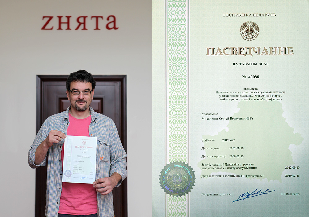 сегодня получил Свидетельство о регистрации товарного знака... теперь ZНЯТА это товарный знак и защищается законами РБ... :)