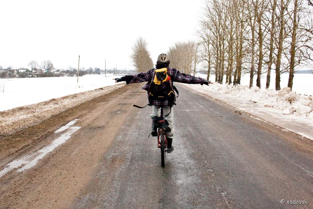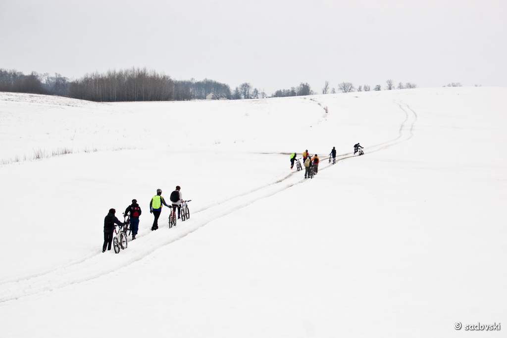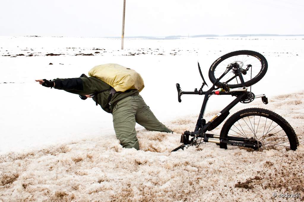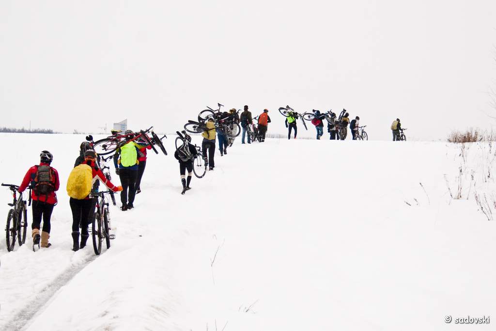 Tще 27 февраля состоялся мой первый большой выезд на велике за город. Всё немножко подтаивала, новигатор поездки легких путей не искал и мы не только ехали, но и шли/тащили велики на себе по полям. для первой вылазки 90 км получилось вполне неплохо.