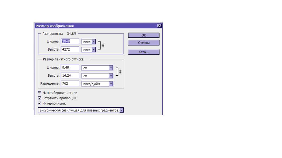 Уберите галочку с Интерполяция. Введите значение Разрешение - 300 dpi и нажмите OK.