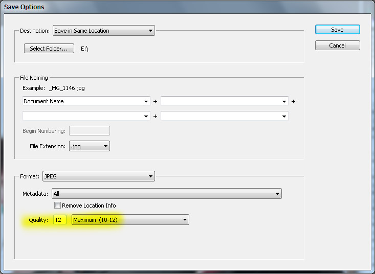 На скриншоте показано, где нужно указывать качество файла при сохранении в jpg.