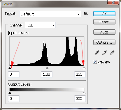 Понял почему у меня не получалось. Потому, что двигал я средний ползунок, а нужно двигать крайние - точку чёрного или белого (см. скиншот, эти точки указаны красными стрелками)