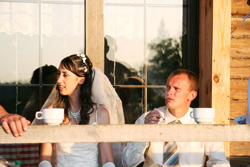 Взял за серую точку для баланса белого тень от балки на рубашке у жениха. Получилось чуть-чуть холоднее всё изображение. Вообще, согласен с тем, что свет от заката на фото должен оставаться естественным.