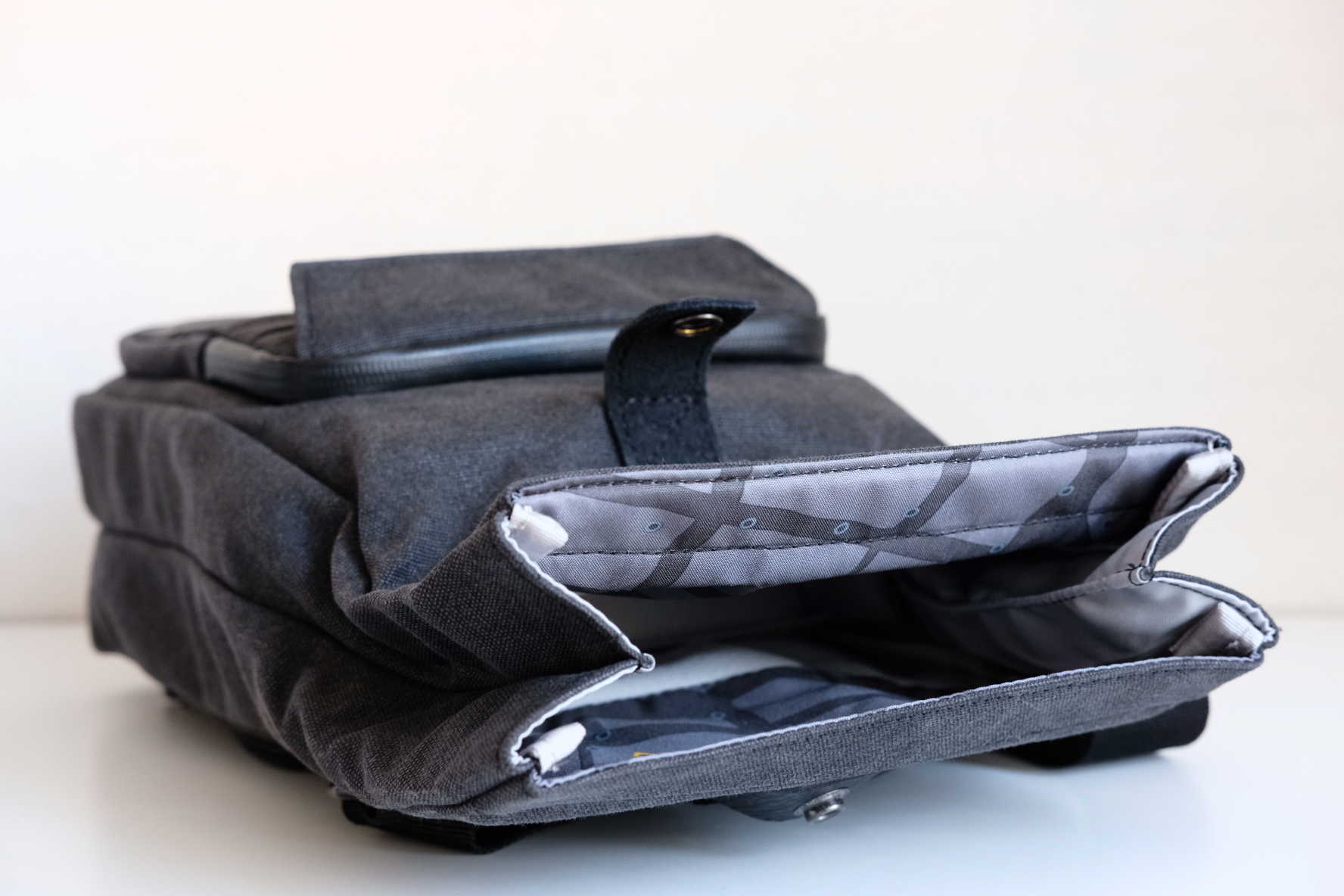 Верхняя часть со сворачивающимся клапаном предназначена для личных вещей, туда можно положить завтрак или небольшую косметичку.