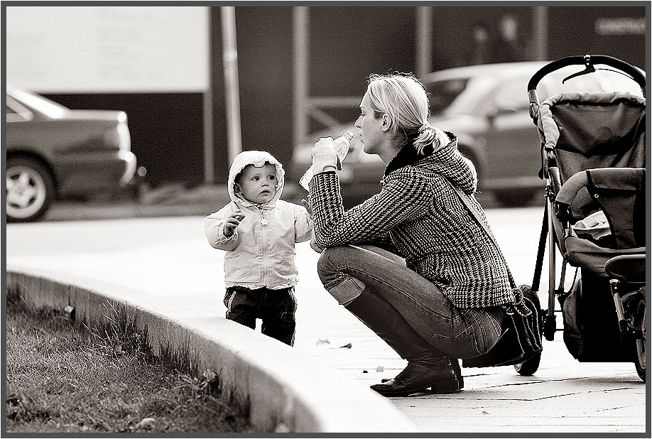 Вильнюс... люблю там снимать... люди там не шугаются фотокамеры... эту девушку с ребенком пас 20-30 минут, на меня ноль внимания... да, был телевик, но находился от них метрах в 30-ти и не заметить меня с 70-200 направленным на них было не реально...