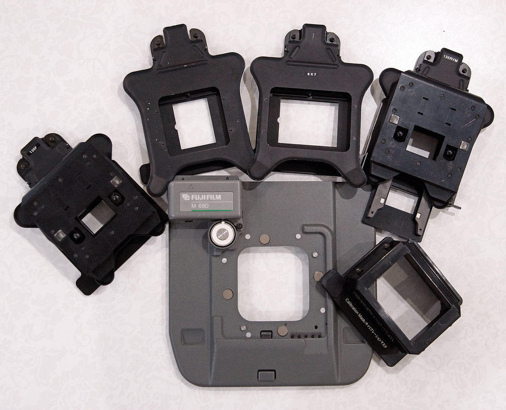Мануальный кариер для фотоминилаборатории FUJIFILM Frontier 330/340 M69D + набор масок для печати и сканирования с одиночных слайдов в рамках, коротких (от одного кадра пленки) 135, 120/220 плёнки, калибрационная маска для настройки кариера. С помощью данного комплекта можно напечатать фотографии и оцифровать ч/б, цветную негативную пленку, с одиночных негативов и слайдов в рамках, и без. Устанавливается вместо автоматического кариера на минилаб.