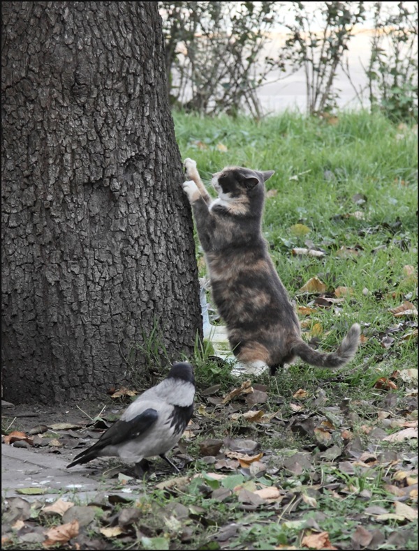 По теме фотографии Александра Зозули про личные отношения между животными сегодня сделала свое дополнение. Наблюдала на улице за отношениями между котом и вороной, которая вела себя очень нагло: выгоняла с газона кота и даже хватала его клювом за хвост. Кот рассердился и... стал демонстрировать свою силу - точить коготки о ствол дерева. Противница намек кота поняла и немедленно улетела.