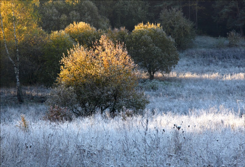 Первые утренники меня всегда очаровывают. Еще в разгаре золотая осень, а ранним утром заморозок все вокруг преображает. Так далеко за настроением мне не надо ехать, из дома 10 минут пешком - и я уже почти за городом, хотя эта местность (фото 1) ещё его продолжение. Сегодня погуляла с внуком в парке Жилибера, встретила трёх незнакомых фотолюбителей - в парке листопад.