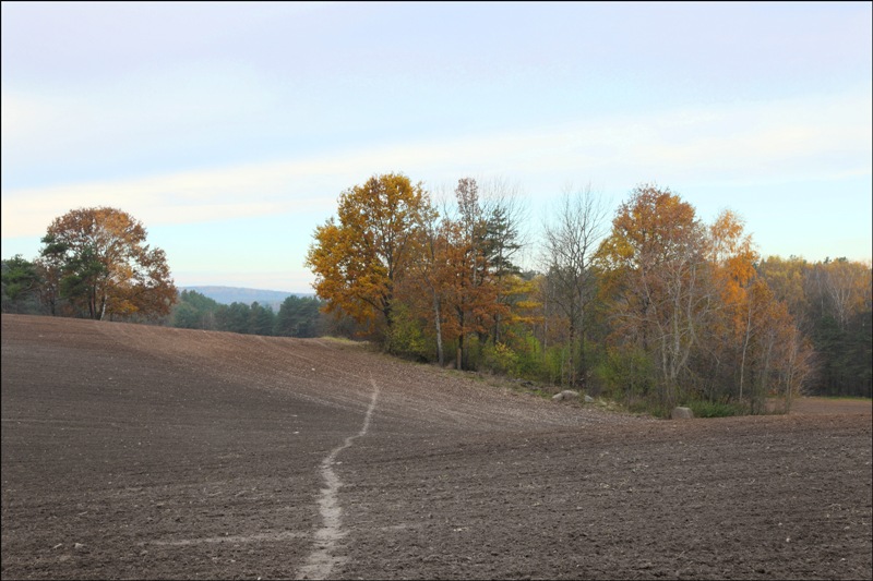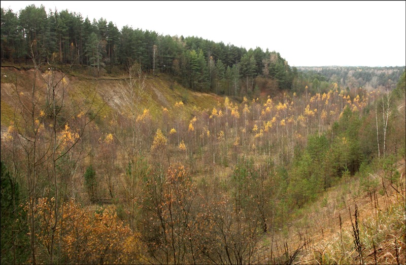 Дорогу к пляжу выбрала через поле, старый карьер "Меловые горы" и сосновый лес, в котором стоят частные дома жителей этой местности (см. фото).