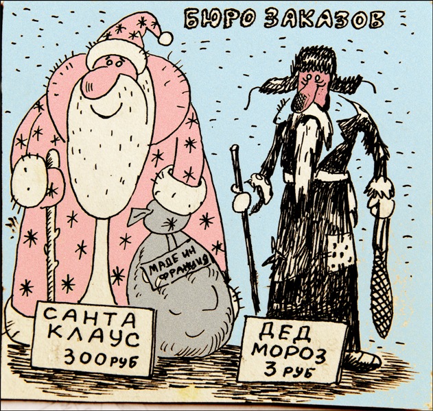 Валерий, и транспоранты: "Да здравствует Новый год!", "Слава новогодней ёлочке!", "Дадим родине еще раз кинофильм "Ирония судьбы", "Ура салату-оливье!", "Вперед к победе не напиться!", "Санта-Клаусы всех стран объединяйтесь!" и т. д.