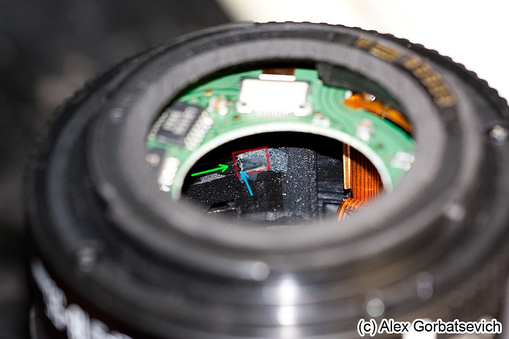 сразу обращу внимание на 2 винтика с которыми в первый раз у меня возникли сложности. я их не заметил и не мог понять почему же после откручивания 4 торцевых винтиков не снимается задняя крышка. вот они по краям контактной группы в желобке на боку объектива.
