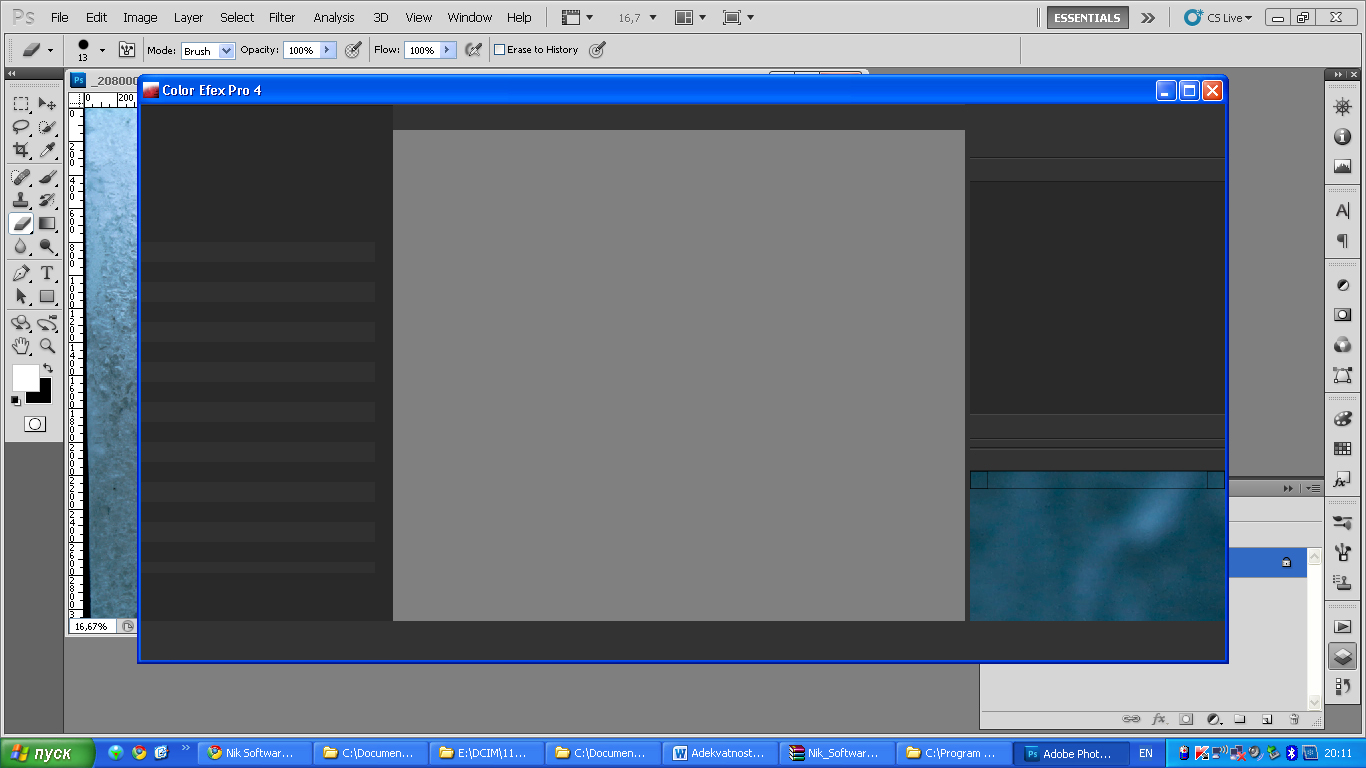 Столкнулась с проблемой, до этого пользовалась 7 виндой, но комп жутко висел пришлось форматировать и записать ХП. Да и фотошоп я обновила с 4 на 5. в процессе когда я устанавливаю Color Efex Pro 4 у меня все вроде был норм, но когда открывается окно с фильтрами, весь экран черный, и никаких букв, только картинка в нижнем углу.