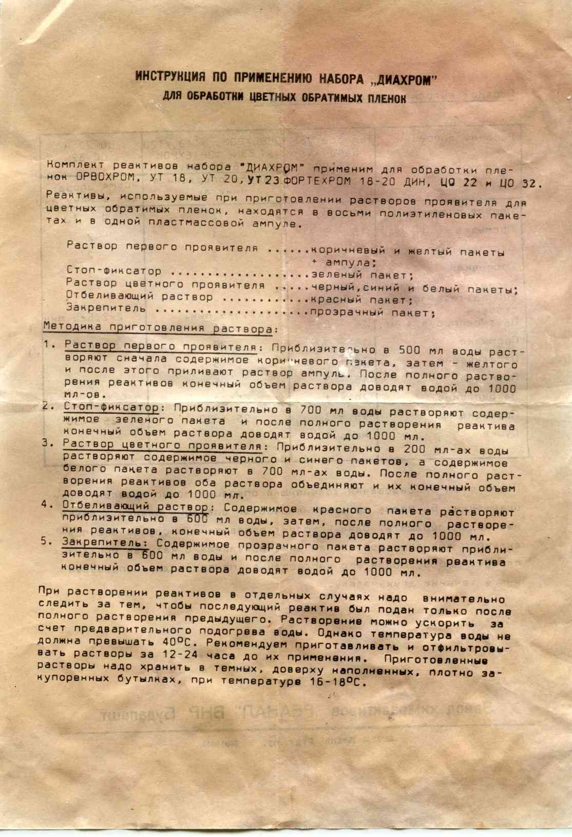 Есть коробка с разнацветными пакетиками, (КОРИЧНЕВЫЙ,ЖЕЛТЫЙ и АМПУЛА -раствор 1-ого проявителя,ЗЕЛЕНЫЙ-стоп-фиксатор,ЧЕРНЫЙ,СИНИЙ И БЕЛЫЙ - раствор цветного проявителя, КРАСНЫЙ- отбеливатель,БЕСЦВЕТНЫЙ-закрепитель)