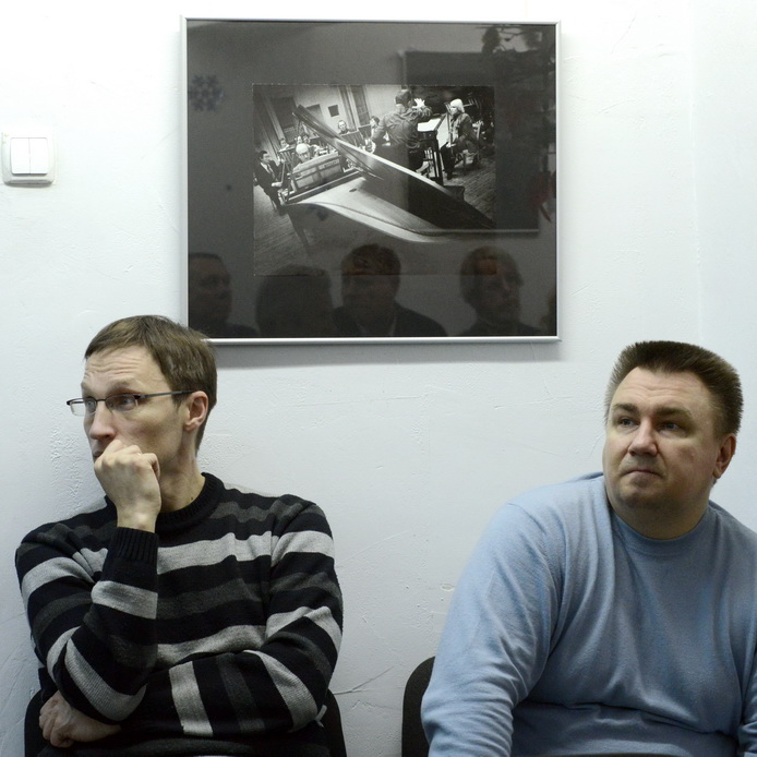 Работы, отобранные ранее для показа коллективно во вторник 6 января, но не вошедшие в экспозицию, тоже выложили в ряд на клубном столе (по предложению Владимира Блинова).