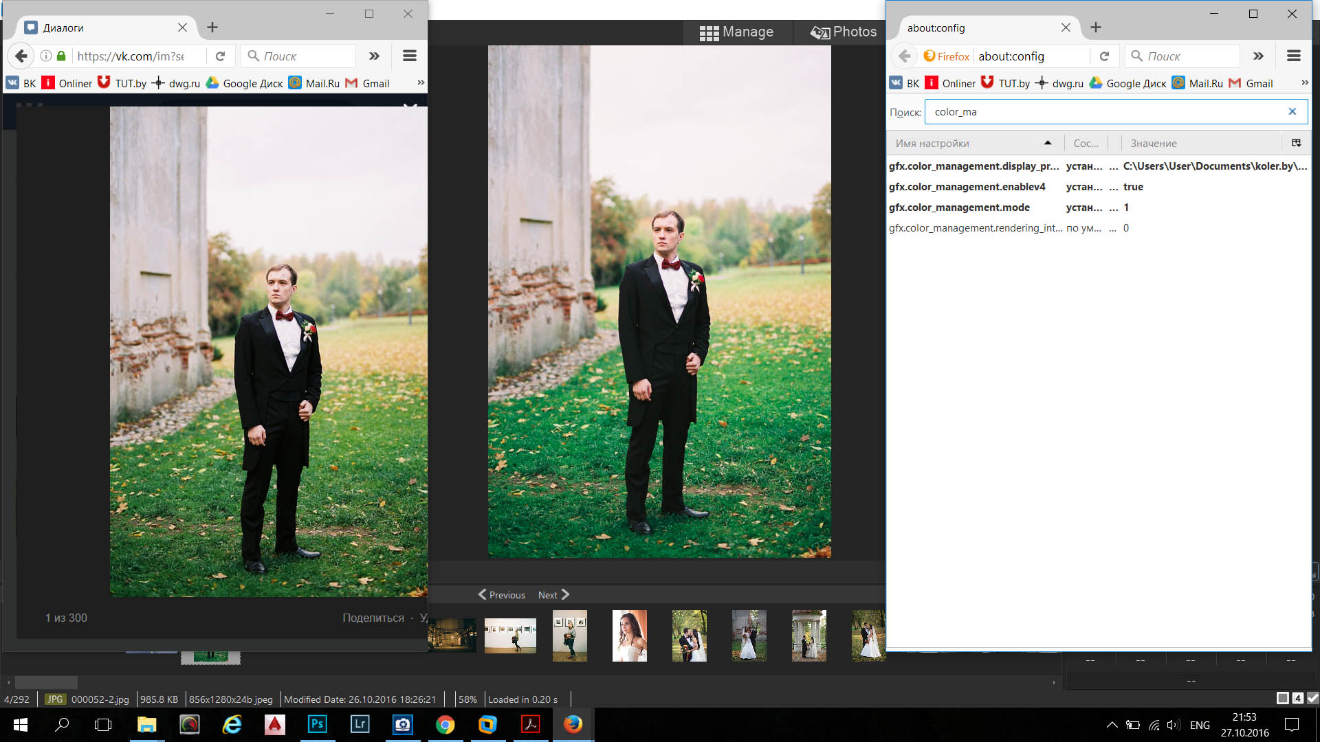 слева-снизу - фото открыто в Firefox с установленным (!!!) color mangement и выбранным корректным цветовым профилем (дисплей калибровал у вас, кстати).