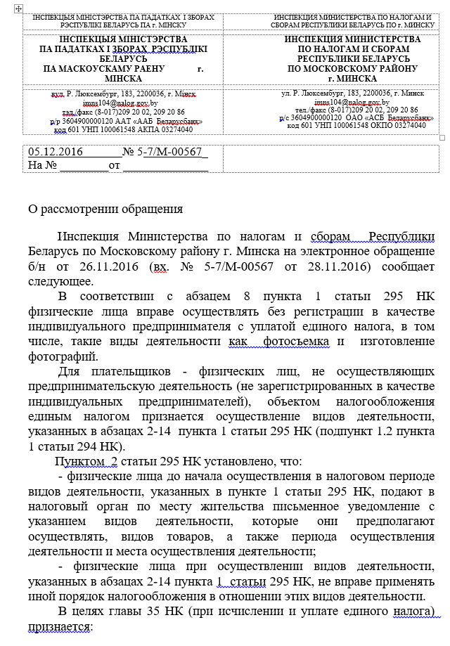Здравствуйте всем! Подскажите пожалуйста! Создал группу в ВК "БЕСПЛАТНЫЙ СВАДЕБНЫЙ ФОТОГРАФ" и начал бесплатно снимать свадьбы передачей молодым обработанных фото для приобретения опыта. Пошёл подробности уточнить в налоговой по поводу единого налога и возможности применения (УПРОЩЁННОЙ ФОРМЫ НАЛОГООБЛАЖЕНИЯ). На что мне ответили, что только возможно работать с Единым налогом в качестве фотографа. Да ещё сказали что даже бесплатно работать на свадьбе Вы не имете права без уплаты Единого Налога!