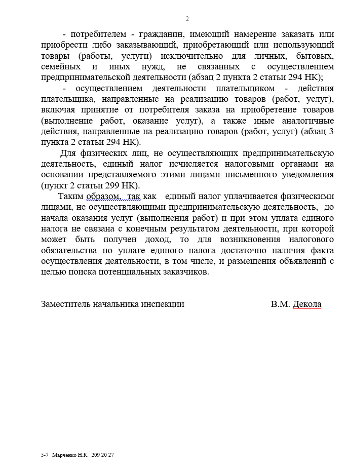 Таким образом, так как единый налог уплачивается физическими лицами, не осуществляющими предпринимательскую деятельность, до начала оказания услуг (выполнения работ) и при этом уплата единого налога не связана с конечным результатом деятельности, при которой может быть получен доход, то для возникновения налогового обязательства по уплате единого налога достаточно наличия факта осуществления деятельности, в том числе, и размещения объявлений с целью поиска потенциальных заказчиков.