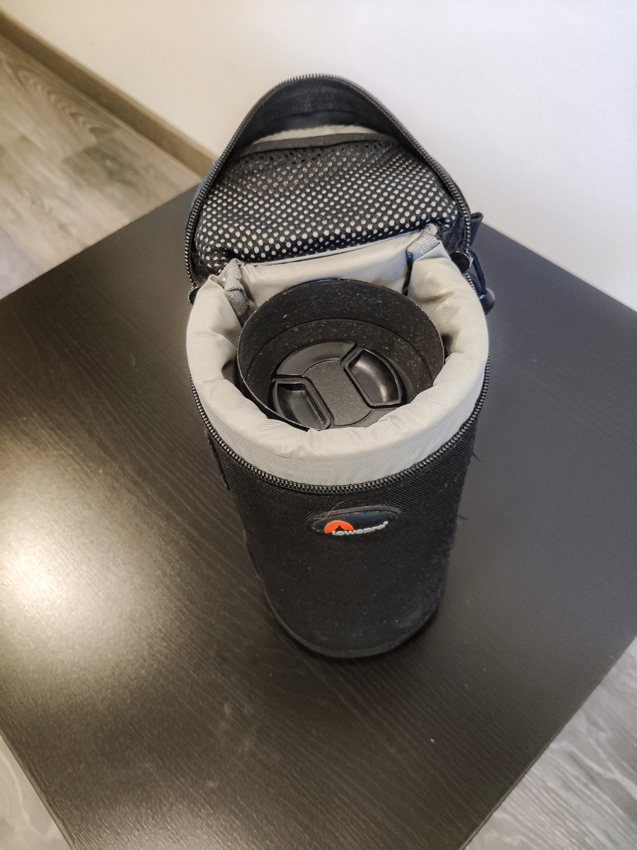 В комплекте крышки, бленда и прекрасный кофр для хранения и переноски Lowepro Lens Case