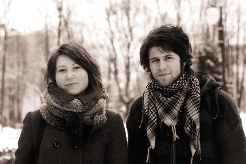 Зенит я сейчас всегда таскаю с собой на случай встречи знакомых, с которыми давно (ну или не давно) не виделся. И вот встречаются два знакомых мне человека. Захотелось их сфотографировать. Выбираю место – улица, без прямых солнечных лучей. Человека два, и кроме как расположить их в одной плоскости, параллельной пленке, ничего в голову не пришло. Нужно что-то, что придавало бы небольшую интересность кадру. Выход – снимаю на фоне деревьев, чтобы заодно проверить, какое боке нарисует Гелиос на таком расстоянии (диафрагма была 4, фокус метрах в 4-5, до деревьев метров 40). Долго прицеливался, чтобы голова девушки не оказалась на фоне дома, а парня – на фоне елки, да так до конца и не получилось. Еще по кадрированию: кажется, что слева вверху "пустое пространство", может надо было его меньше оставить.